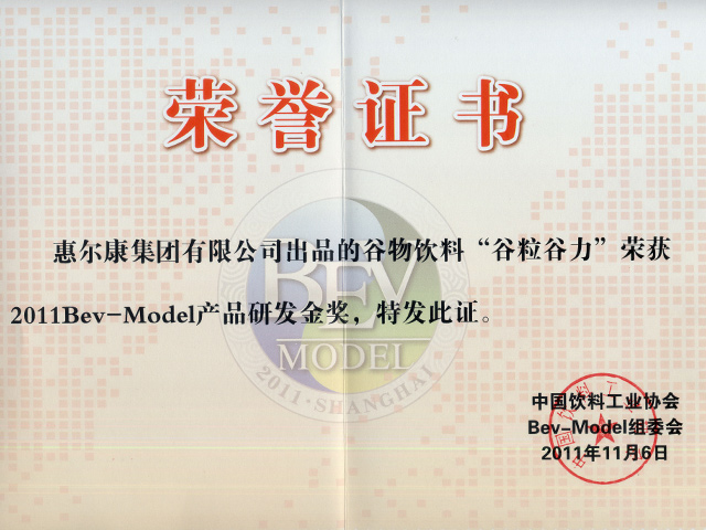 中国饮料工业协会授予谷粒谷力2011Bev-Model产品研发金奖