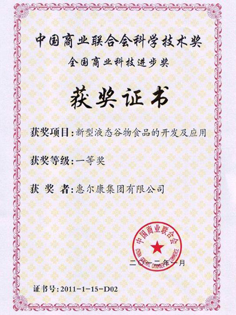 中国商业联合会揭晓中国商业联合会科学手艺奖-天下商业科技前进奖一等奖(新型液体谷物食物的开发及应用)